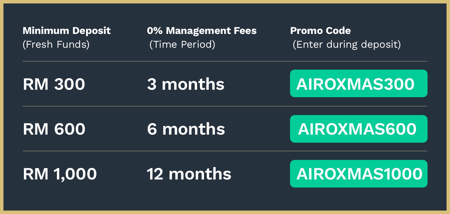 3. Qualifying Deposit: To qualify for the 3, 6 & 12 month Management Fee Waiver (hereafter referred to as "Benefit"), Participants must successfully deposit a minimum of RM300 into any Airo portfolio during the Promotion Period. The Benefit will commence on the first day of the next month following the portfolio activation, and will end on the last day of the final Benefit month. Benefit month will commence from January 2025 and end in accordance with the time frame of the chosen promo code.